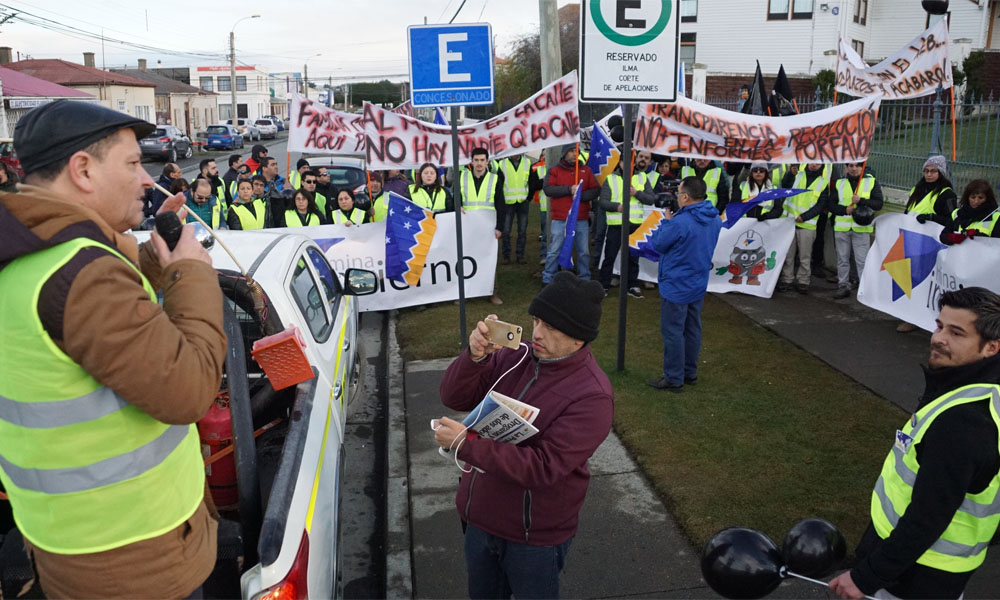 Punta Arenas. 29 junio 2019. Al frente de la Corte de Apelaciones de Punta Arenas un centenar de manifestantes convocados por el Comité por la Defensa de Magallanes, Codema, protestaron ayer por la decisión del Tercer Tribunal Ambiental de Valdivia de mantener la medica cautelar que prohíbe las tronaduras bajo la cota cien a Mina Invierno la que ha provocado la desvinculación de más de 230 personas que se desempeñaban en el yacimiento carbonífero ubicado en Isla Riesco.