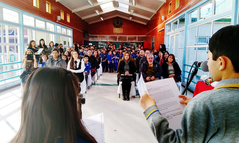 Punta Arenas. 20 agosto 2019. Encabezados por el Seremi de Energía de Magallanes, Nolberto Sáez y su par de Educación, Beatriz Sánchez, junto al Programa Territorial Integrado (PTI) “Magallanes Energía Inteligente” de Corfo, distinguieron en la categoría Enseñanza Básica del Concurso Audiovisual Estudiantil #YoSoySostenible, a la escuela municipal Elba Ojeda de Río Seco, por su destacada y meritoria participación en la iniciativa pedagógica. El reconocimiento recayó en los alumnos de 3ro y 4to básico Sofía Paredes, Carlina Corvalán y Mateo Fernández.