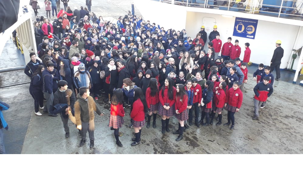 Punta Arenas. 21 agosto 2019. Más de 300 de estudiantes de escuelas públicas realizaron este lunes una navegación por el Estrecho de Magallanes a bordo del ferry Pathagon de Tabsa con el propósito de finalizar la Semana del Niño. La actividad se concretó a solicitud de la Gobernación Provincial de Magallanes.