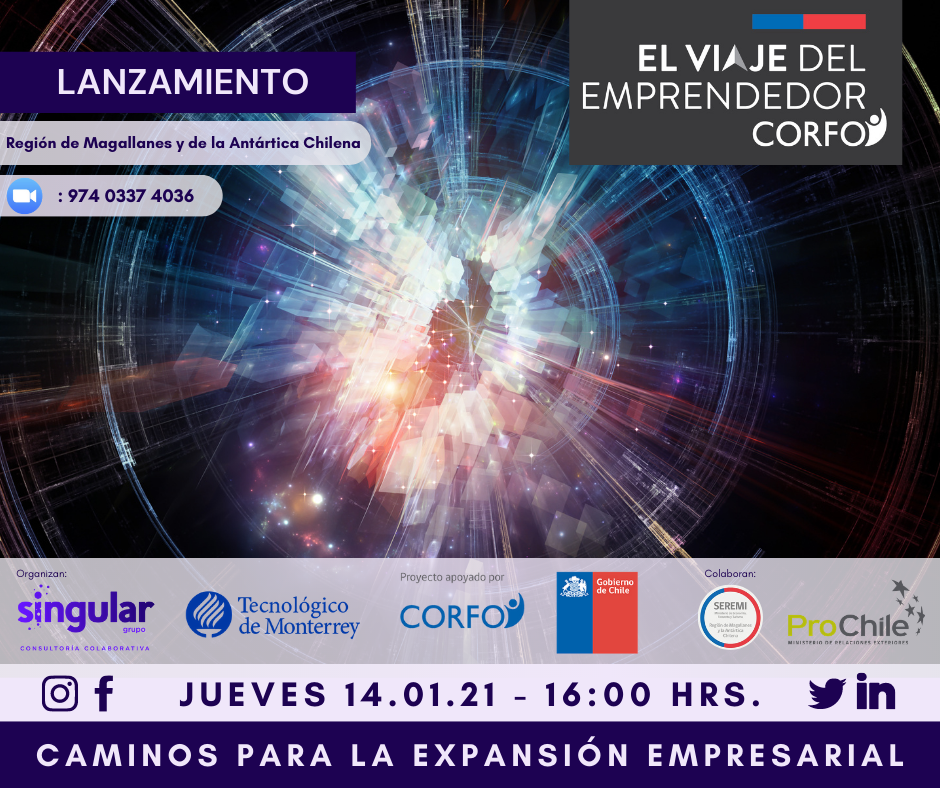 Punta Arenas. 10 enero 2021. Potenciar el proceso de adaptación de las empresas ante la nueva realidad y promover su expansión a través de la elaboración de estrategias ante los nuevos escenarios globales de las mipymes de la región de Magallanes, son los principales objetivos del programa “Caminos para la expansión empresarial: modelos para hacer frente a la crisis”, ejecutado por el Grupo Singular en alianza con Tecnológico de Monterrey con la colaboración de la Seremía de Economía y ProChile y cofinanciado por Corfo bajo la línea Viraliza de El Viaje del Emprendedor.