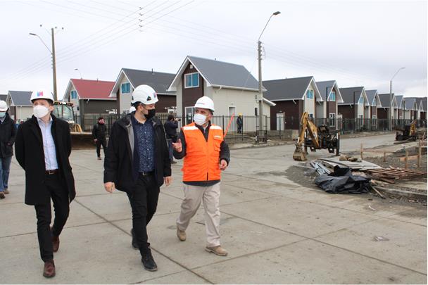 Punta Arenas. 26 abril 2022. Las autoridades regionales del Ministerio de Vivienda Y Urbanismo, seremi Marco Uribe Saldivia y el director (s) de Serviu Omar González Asenjo, junto al equipo de gerentes de la constructora y la inmobiliaria Salfa, visitaron los loteos Enrique Abello 3 y Enrique Abello 4 para constatar en terreno, la continuidad del ritmo normal de las obras de construcción, que fueron ralentizadas a principios de abril por actos administrativos respecto a los pagos de las obras ejecutadas.