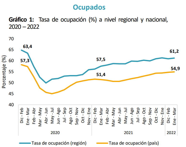 Respecto al mismo trimestre móvil del año 2021, se registra un aumento en 6.416 personas ocupadas, lo que corresponde a un alza de 3,7 puntos porcentuales (p.p.) en la tasa de ocupación regional.