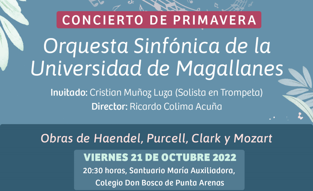Punta Arenas. 21 octubre 2022. Hoy a partir de las 20.30 horas la Orquesta Sinfónica de la Universidad de Magallanes realizará, en el Santuario «María Auxiliadora», su tradicional Concierto de Primavera. La dirección orquestal estará a cargo de Ricardo Colima Acuña y contará con la participación del solista en trompeta, Cristian Muñoz Luza, profesor de la Escuela de Música de La Serena.
