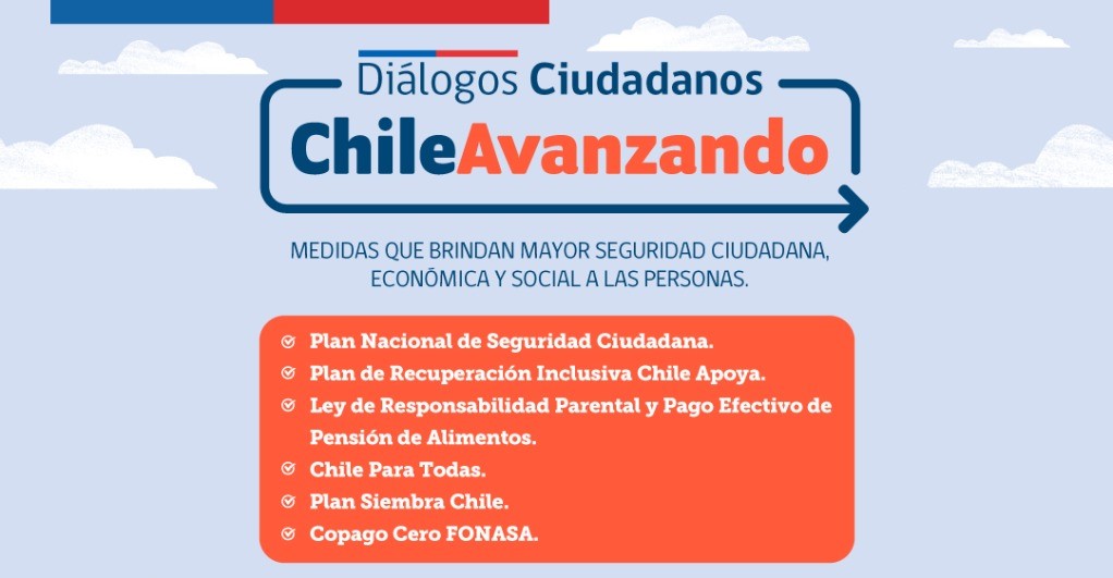 Punta Arenas. 21 noviembre 2022. Ayer se realizó el Primer Diálogo Ciudadano, “Chile Avanzando”, una iniciativa nacional que busca ser un conversatorio sobre los avances del gobierno en materias de seguridad en tres áreas: Seguridad ciudadana, seguridad social y seguridad económica. Allí se presentaron una serie de medidas, entre las cuales destacan: Copago Cero FONASA, Ley de responsabilidad parental y pago efectivo de pensión alimenticia, y Siembra por Chile.