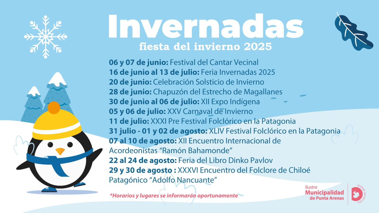 El calendario arrancará el 6 y 7 de junio con el Festival del Cantar Vecinal en el Teatro Municipal José Bohr, evento en el que participarán 12 representantes de juntas de vecinos de Punta Arenas. Entre los eventos más esperados, destaca el tradicional Chapuzón del Estrecho, que se llevará a cabo el sábado 28 de junio en la Av. Costanera del Estrecho, con 7.000 cupos disponibles y cuyas inscripciones se abrirán la primera semana de abril. En tanto, el Carnaval de Invierno se realizará el 5 y 6 de julio en la misma costanera, consolidándose como el evento más masivo de la temporada.