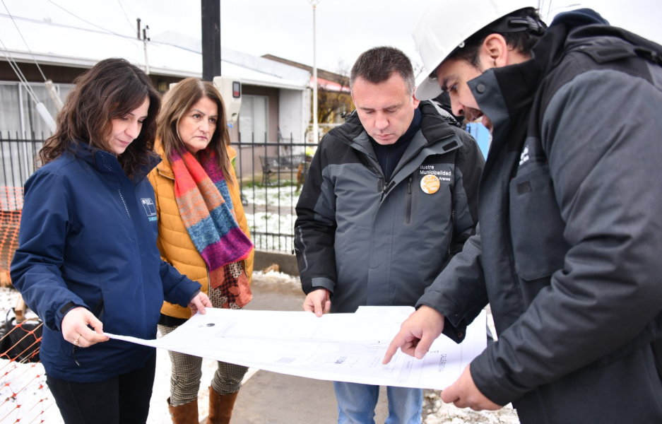 Punta Arenas. 31 julio 2025. Dos plazas ubicadas entre las calles Argentina y José Robert se encuentra interviniendo el municipio a través del Programa de Mejoramiento Urbano de la Subsecretaría de Desarrollo Regional (Subdere). Las obras fueron visitadas la mañana de este miércoles por las autoridades, quienes constataron un 30% de avance.