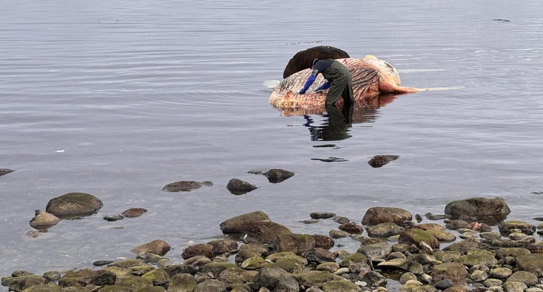 Punta Arenas. 18 agosto 2025. El jueves pasado el Servicio Nacional de Pesca y Acuicultura (Sernapesca) recibió el aviso por parte de una empresa que realizaba faenas de limpieza de playas en el sector del seno Skyring sobre la presencia de una ballena varada muerta.