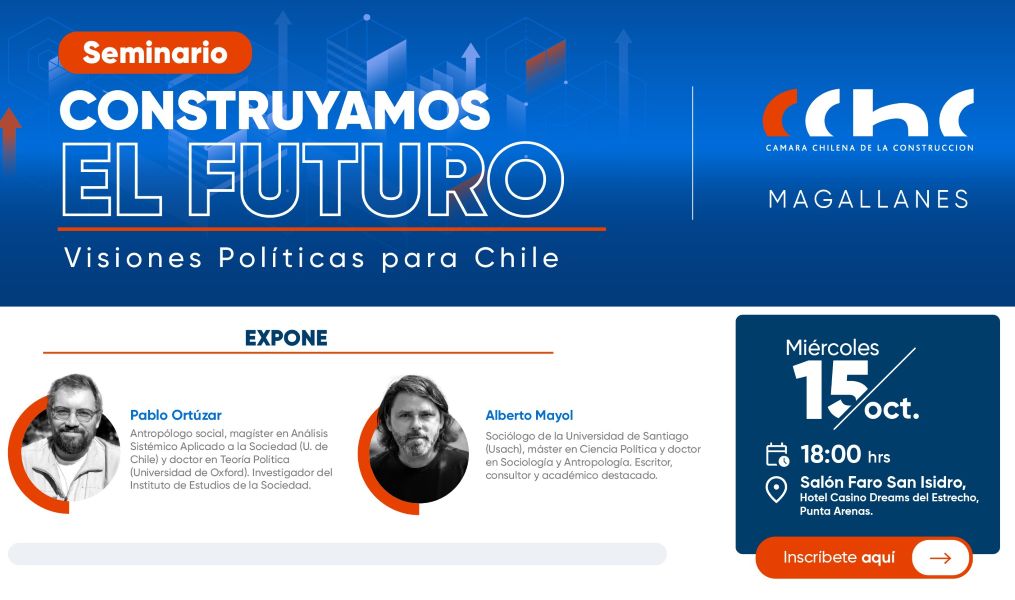 Punta Arenas. 14 octubre 2025. En un año crucial para el devenir político, económico y social de Chile, la Cámara Chilena de la Construcción (CChC) Magallanes invita a toda la comunidad de Punta Arenas y la región a participar en el Seminario «Construyamos el Futuro: Visiones Políticas para Chile», una instancia de análisis, reflexión y diálogo sobre los retos y oportunidades que enfrentará el país en los próximos años.
