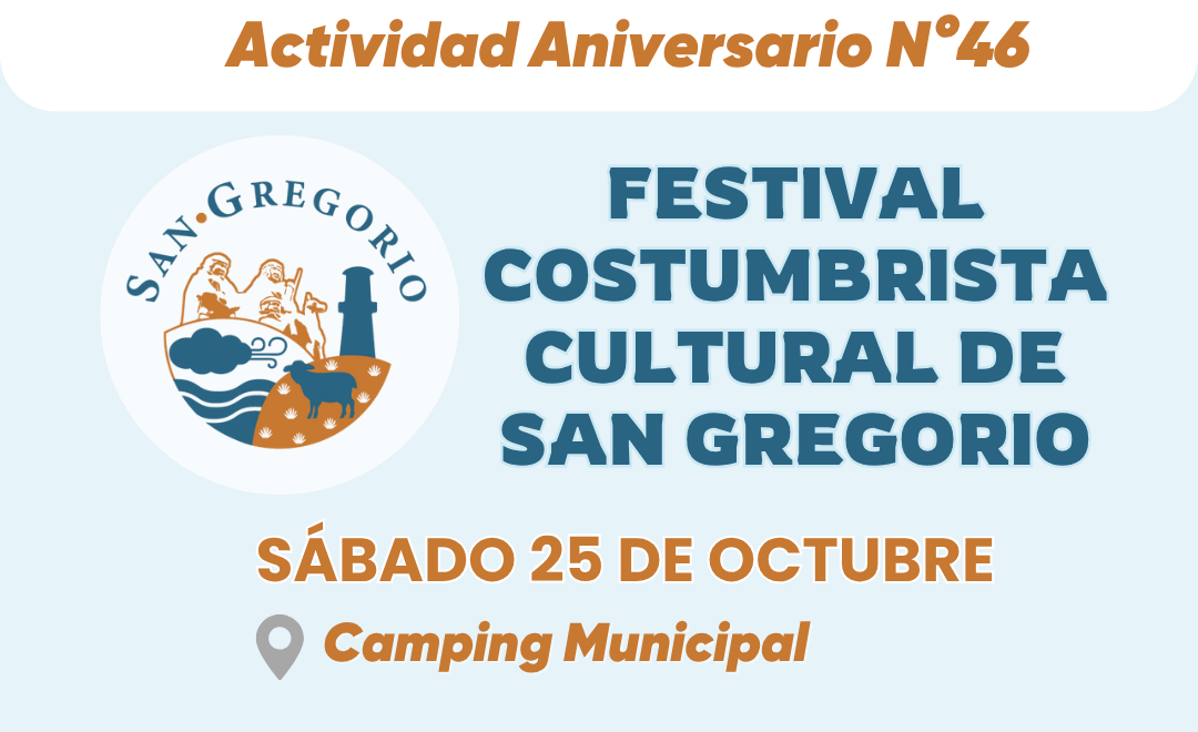 Punta Arenas. 23 octubre 2025. En el marco del 46° Aniversario de la comuna de San Gregorio, la Ilustre Municipalidad invita a vecinas, vecinos y visitantes a participar del Festival Costumbrista Cultural, que se realizará este sábado 25 de octubre desde las 12:00 hrs. en el Camping Municipal de San Gregorio, en la región de Magallanes y Antártica Chilena. La actividad será totalmente gratuita y abierta a toda la comunidad.