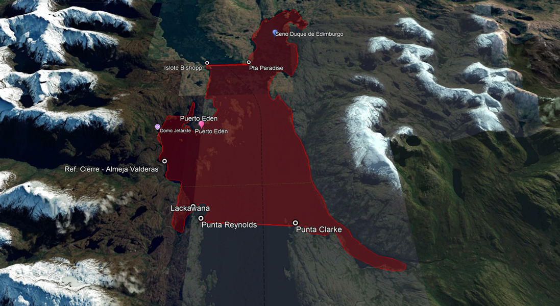 La prohibición de extracción se extiende, al norte, desde el Islote Bishopp (Latitud 49°5’28.48″S; Longitud 74°24’23.02″O), ubicado en la Isla Wellington, hasta Punta Paradise (Latitud 49°5’28.93″S; Longitud 74°22’51.01″O), en el Promontorio Exmouth; y al sur, desde Punta Reynolds (Latitud 49°10’1.42″S; Longitud 74°24’5.89″O), en el lado este de la Isla Wellington, hasta Punta Clarke (Latitud 49°10’12.29″S; Longitud 74°21’29.31″O), en el lado oeste del Promontorio Exmouth.