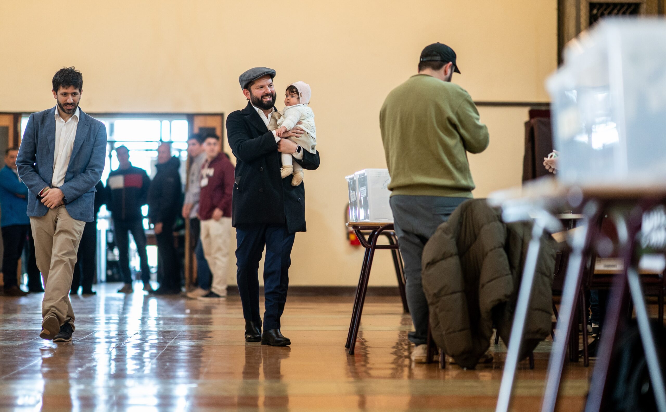 Punta Arenas. 16 noviembre 2025. A tan solo minutos de abrirse las mesas en el liceo Industrial de Punta Arenas, el Presidente Gabriel Boric llegó emitió sus votos acompañado de su padre, Luis Boric.